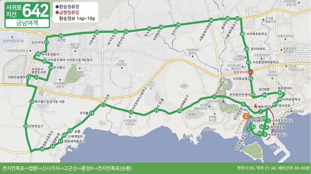천지연폭포 방향으로 가는 642번이 승객을 태우기 위해