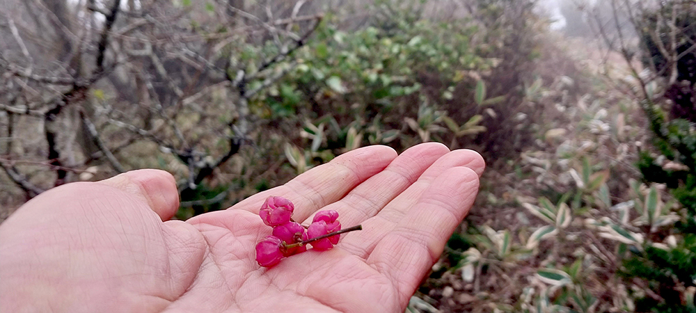 이 추위에 볼빨간 꽃이 핀 살구색 줄사철을 발견하니