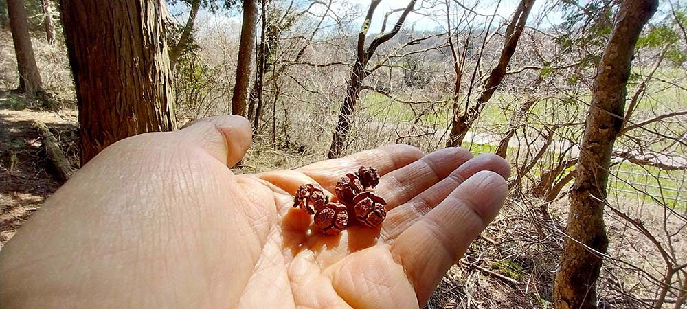 편백나무 아래마다 구슬처럼 동글동글한 것들이