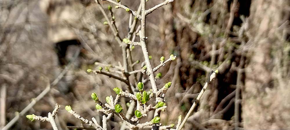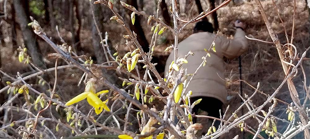 지금 막 노란 꽃봉오리를 틔우는 개나리가 핀